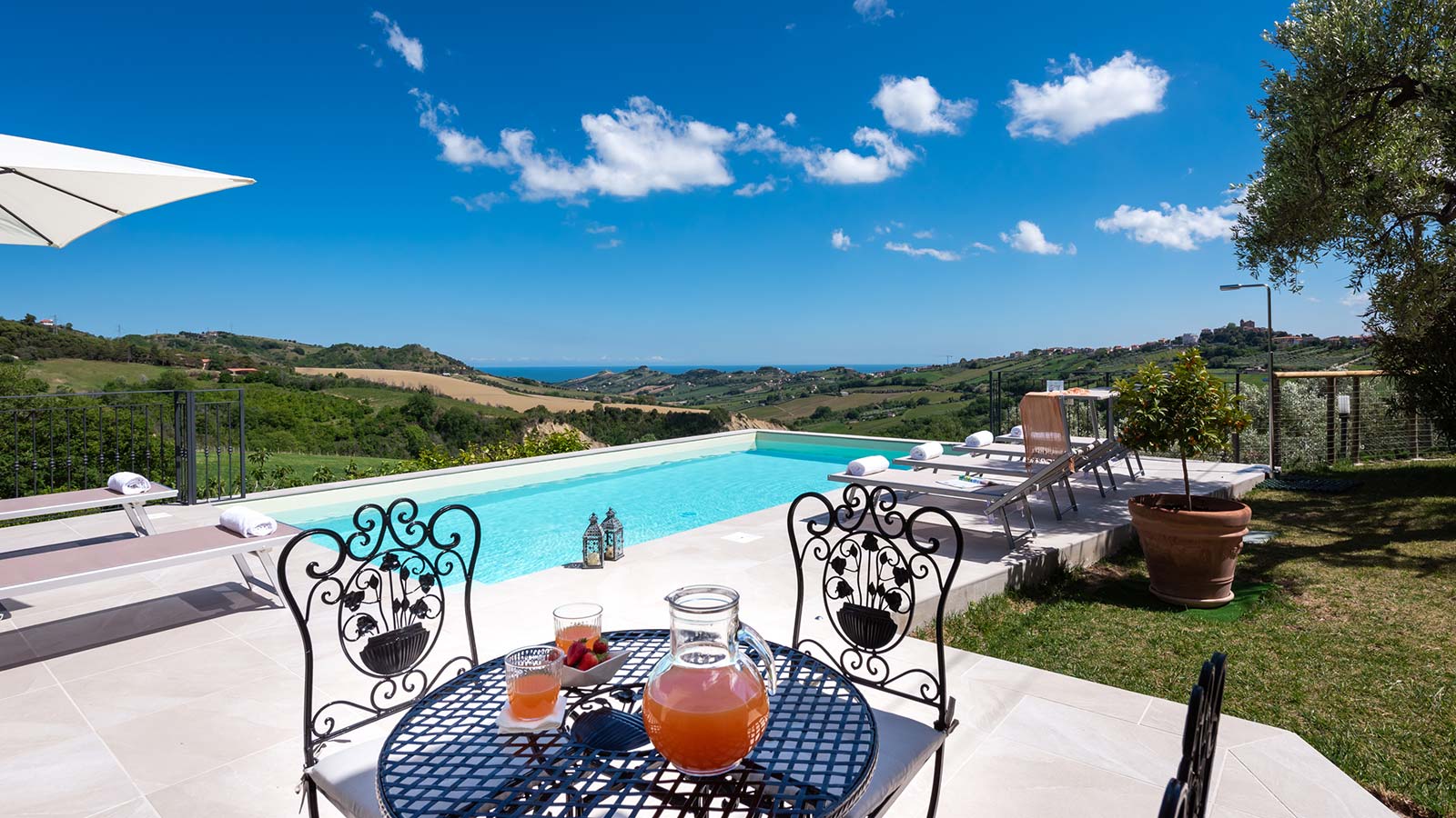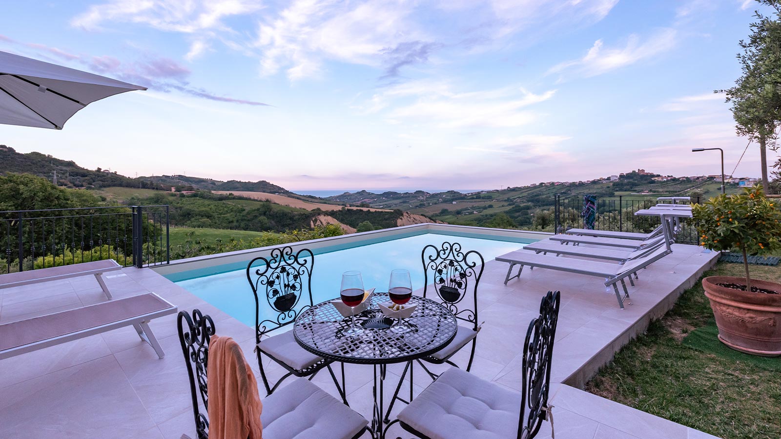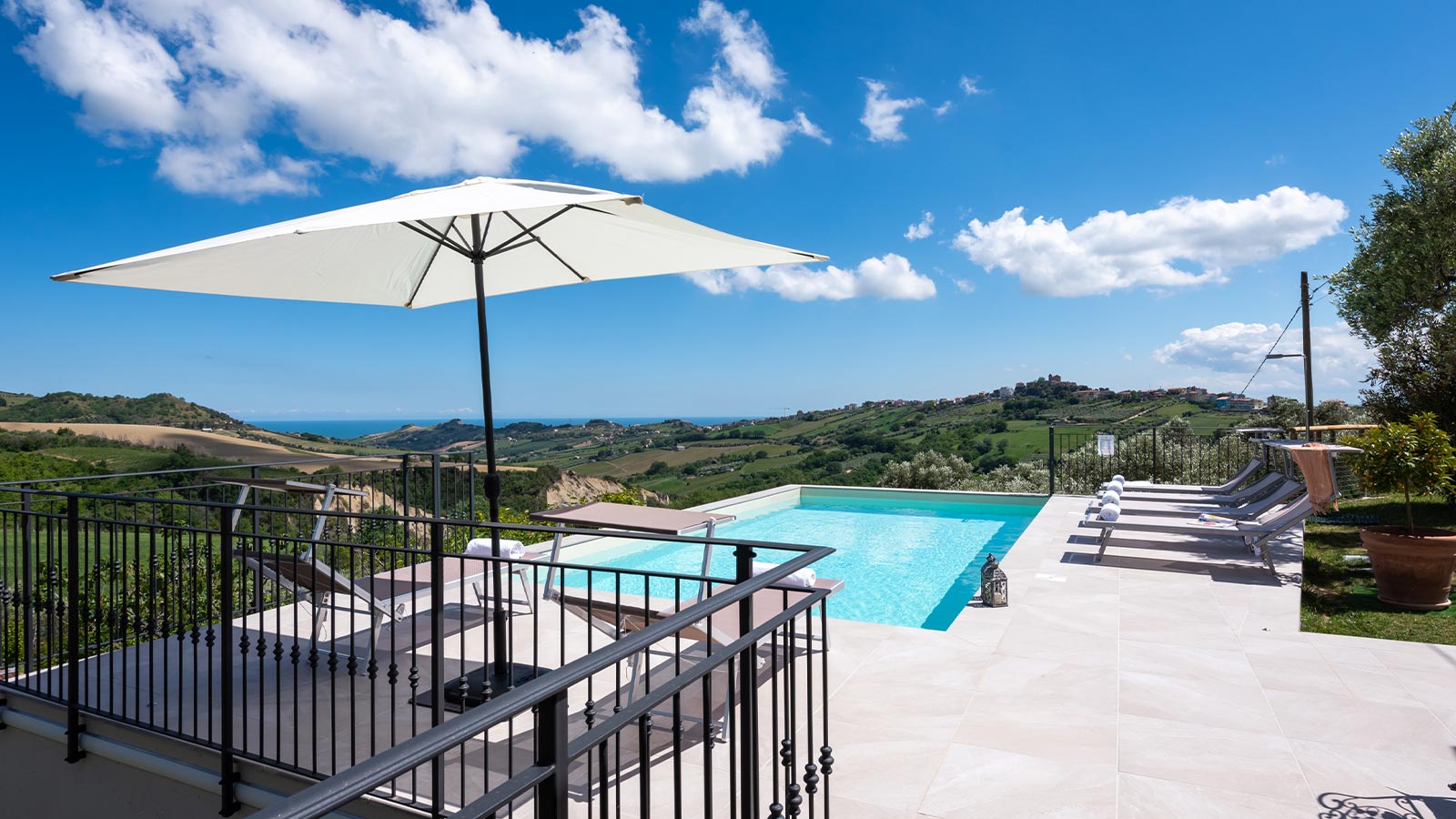 La piscina panoramica è adiacente alla zona living. Di forma rettangolare, misura 8 x 4 m, ha una profondità costante di 1,35 m ed è depurata a cloro. Gode della vista mozzafiato sulle colline e sulla riviera adriatica da un lato, e sulle catene montuose dall’altro. È provvista di illuminazione, sia interna che esterna, presente in tutta l'area circostante. La zona solarium, in parte a prato, in parte pavimentata, è attrezzata con lettini e ombrelloni.