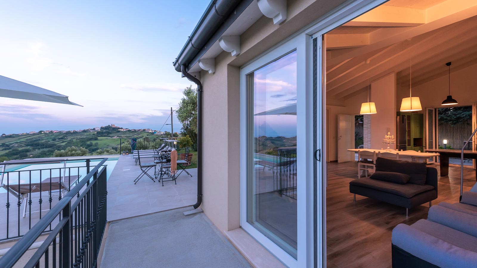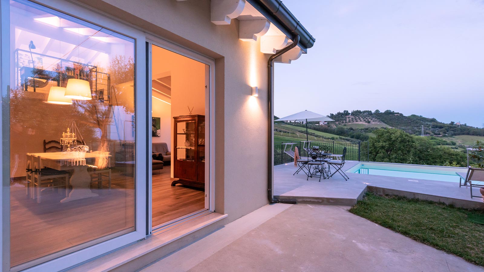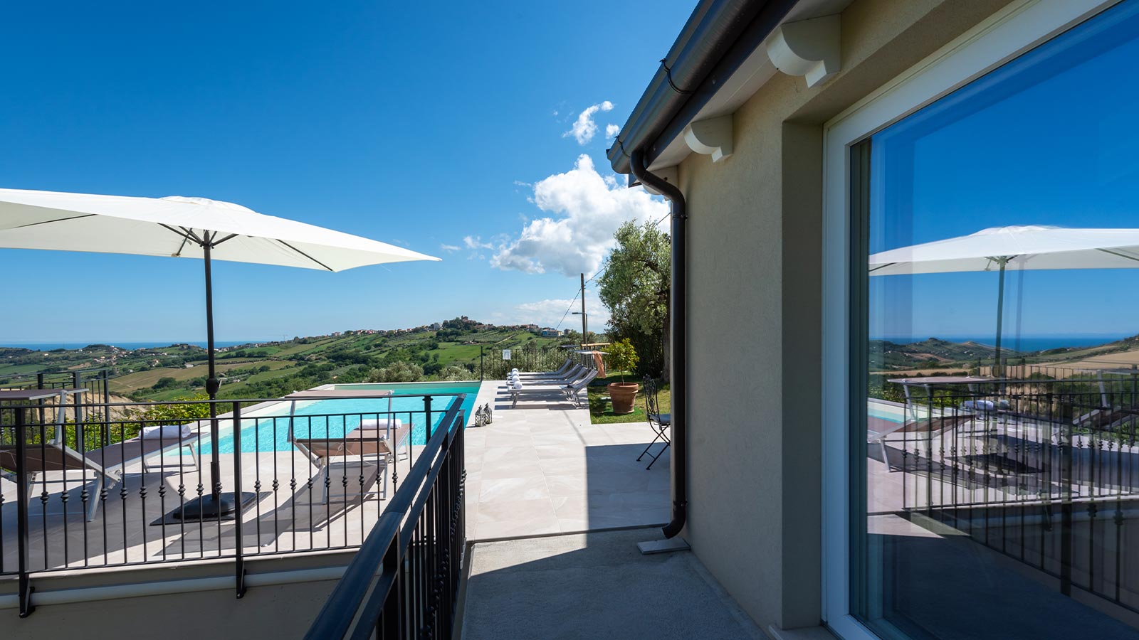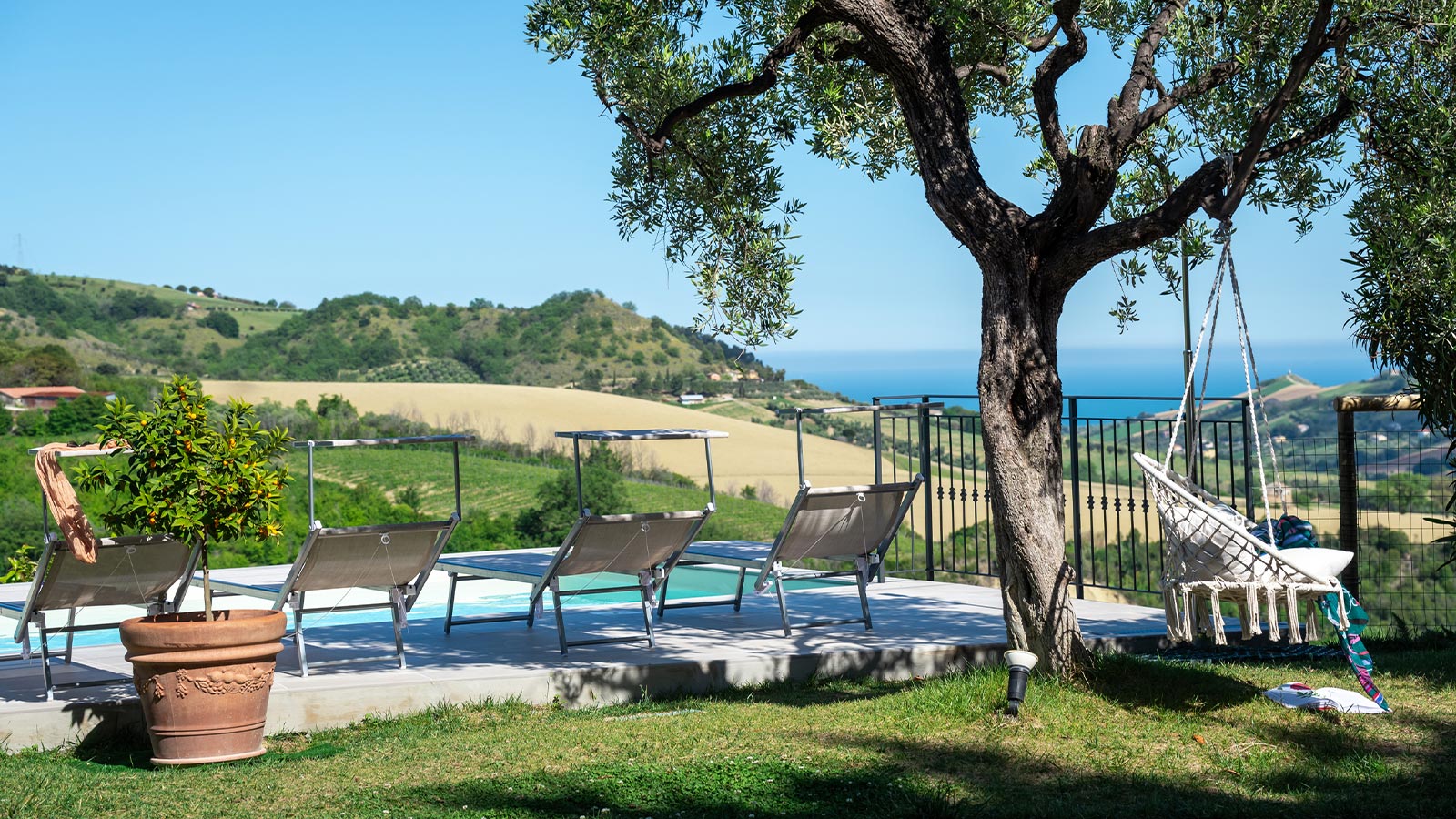 La piscina panoramica è adiacente alla zona living. Di forma rettangolare, misura 8 x 4 m, ha una profondità costante di 1,35 m ed è depurata a cloro. Gode della vista mozzafiato sulle colline e sulla riviera adriatica da un lato, e sulle catene montuose dall’altro. È provvista di illuminazione, sia interna che esterna, presente in tutta l'area circostante. La zona solarium, in parte a prato, in parte pavimentata, è attrezzata con lettini e ombrelloni.